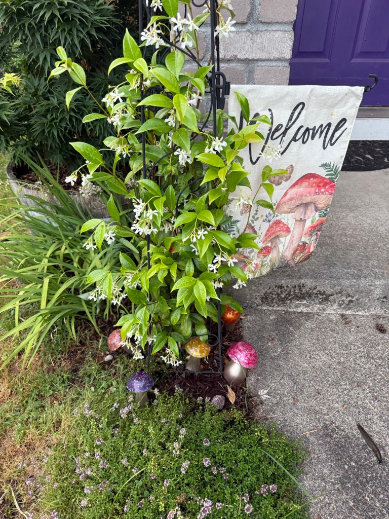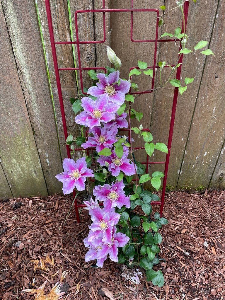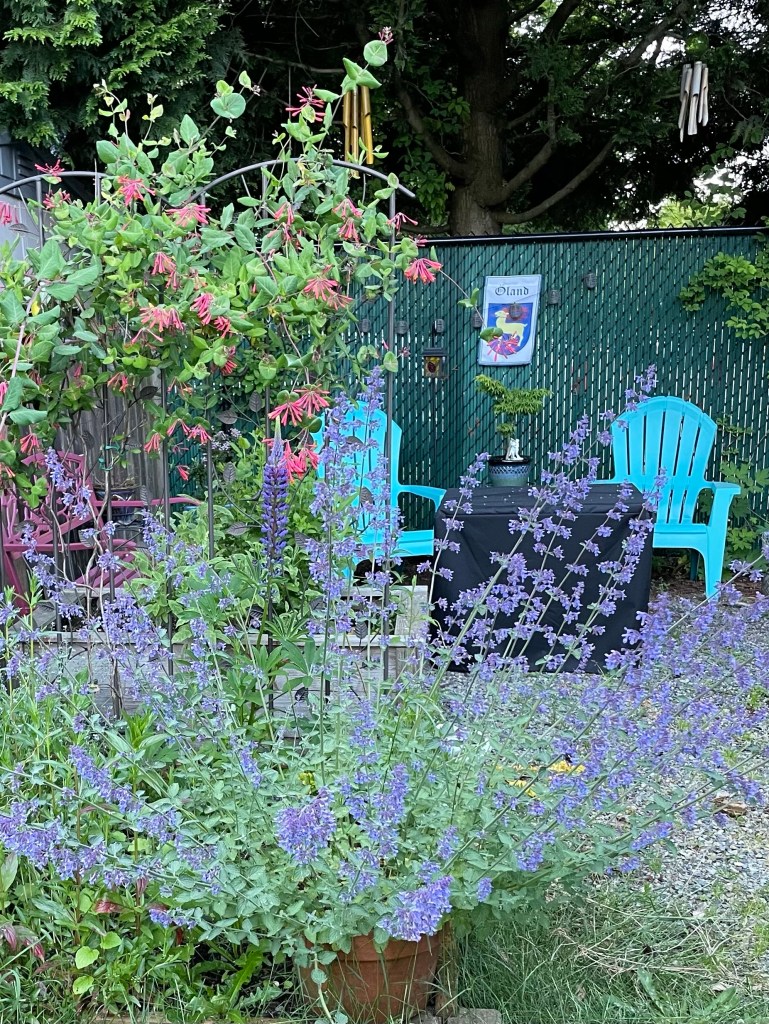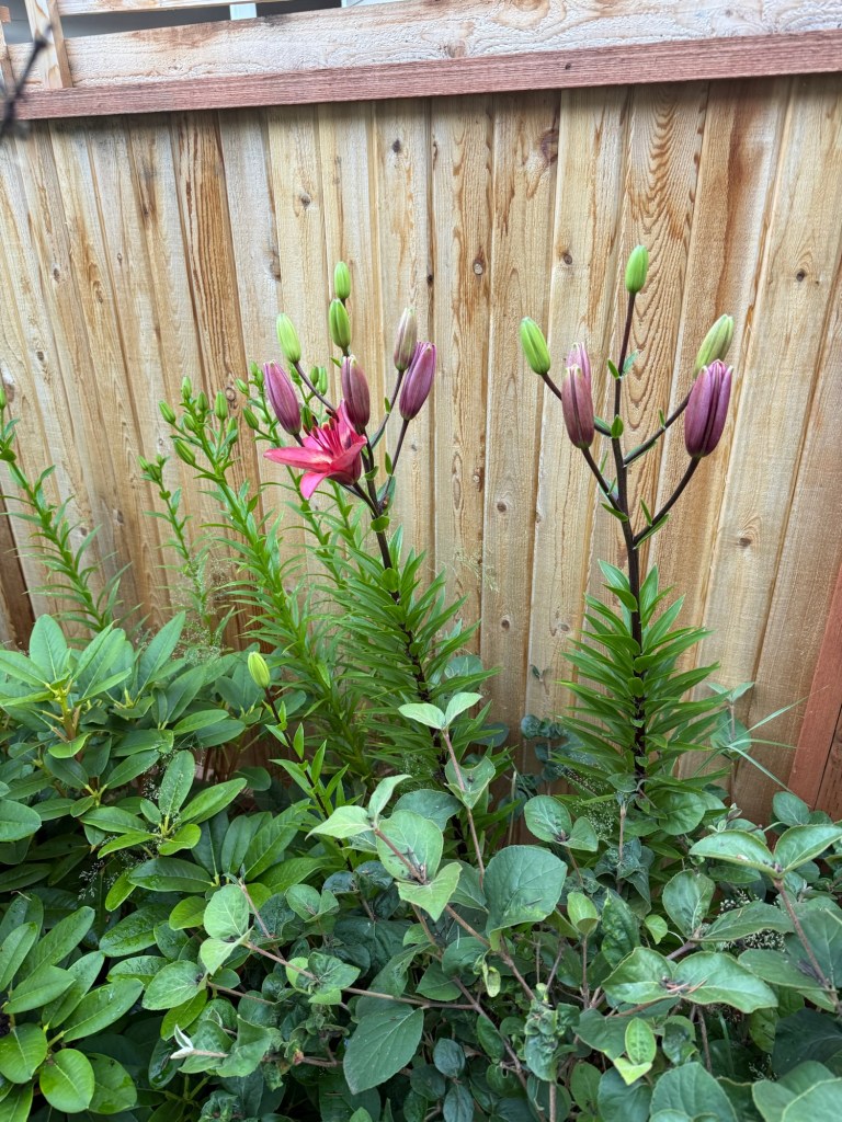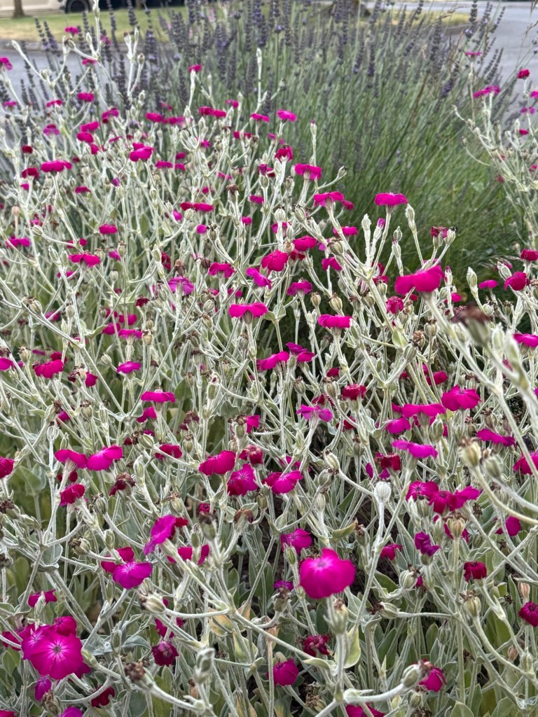 Asiatic Lillies? Peeking open. Clematis? Climbing skyward and smiling (I like to think). Star jasmine? Scenting the air. Lavender? Sweet promises. Rose Campion? Hosting a rock festival. Hydrangeas? Hinting big color. Daisies? Doing their cheerful thing. Catmint? Will survive us all save for the neighborhood cat gang.