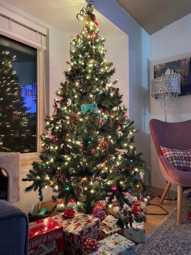 My fake tree has been erected once again to stand in the bay window of my home. Only I put an extra string of multi-colored lights onto its white lighted frame. That’s me. I’m a color girl. And I know that about myself. And my hallmark Snoopy and Woodstock ornament is alive again thanks to the color strand. It lends its light bulb sockets to power Snoopy’s dog house into sleigh action. And that makes me smile despite my time in time out.