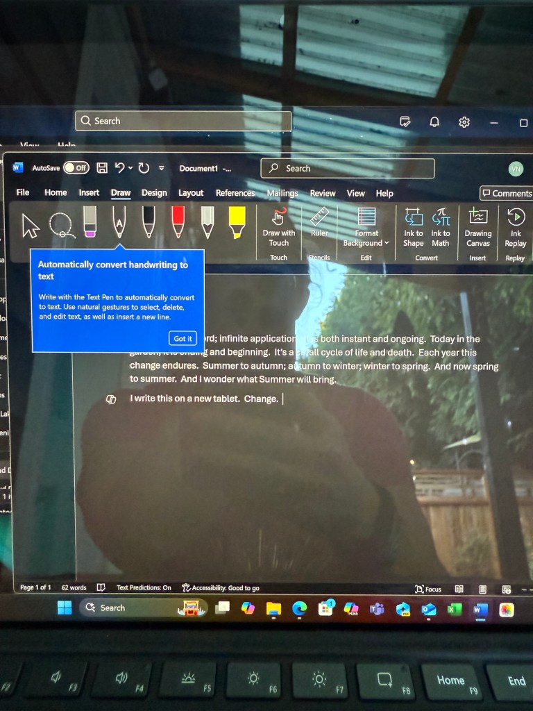 I write this on a new tablet. They keyboard feels different and the commands too. Change. It suggests I write with a stylus pen that will automatically change my writing to type. I love to journal even with my bad handwriting. So I try it. It doesn’t do the thing. In fact, it tells me that it may be hard to read. Rude. Also…not helpful. Quite possibly user error. Change.