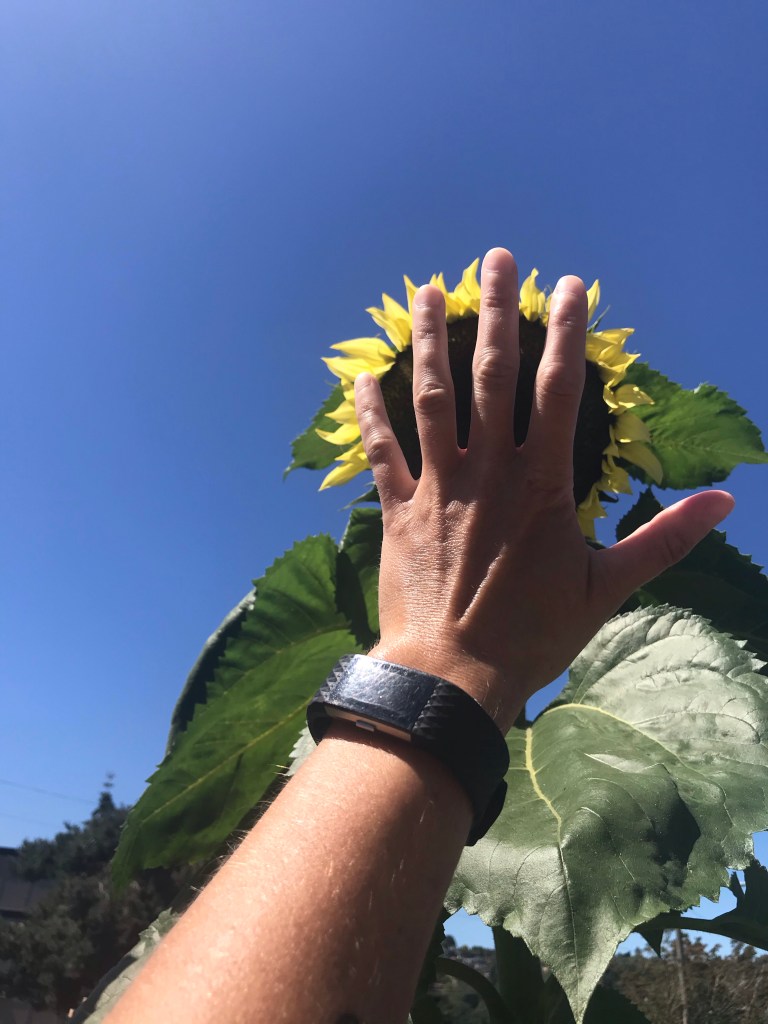 My particular sunflower began to dwarf my hand by mid summer. Of course, being 5 feet tall, my hands aren’t that big, but still. If I could reach the top of it and compare its head to my own, I’m guessing it would be about the same. At this time, several smaller faces had sprouted along its now very sturdy trunk. I say trunk because I think of stems as delicate and this thing is about an inch and a half in diameter. Perhaps less. I’ve never been good with measurements, but maybe I’ll take my tape measure out if I can remember.