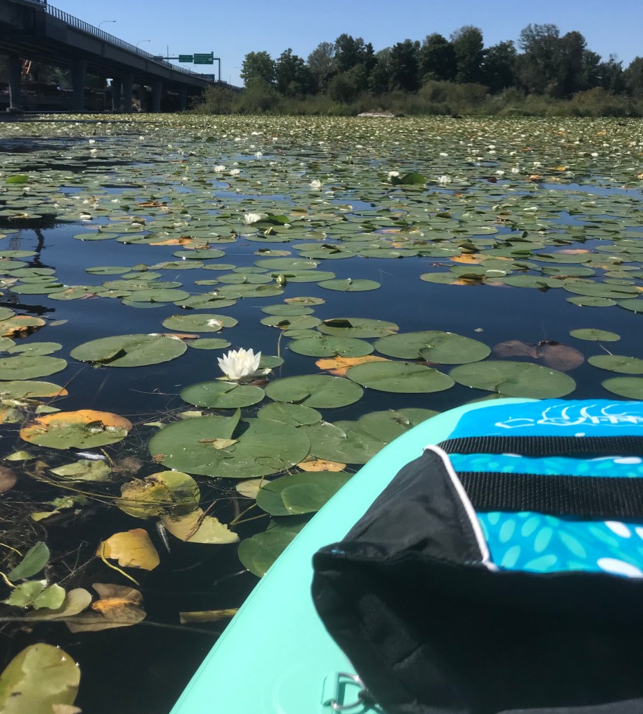 After awhile, I felt secure on my board.  I no longer feared falling in.  If I did, I was prepared for the parts of the plant hidden under the surface.  I no longer thought I would be drowned by them.  I  even began to seek them out and paddled through the water lily laden Washington Park Arboretum.  It was beautiful.  So much life.  I explored a bit and even touched the slimy stems beneath the surface.  Not so bad after all.  Knowledge often conquers fear and so I learned to love real life water lilies with all their parts and not just the pretty flowers on pads that seem to float in paintings.