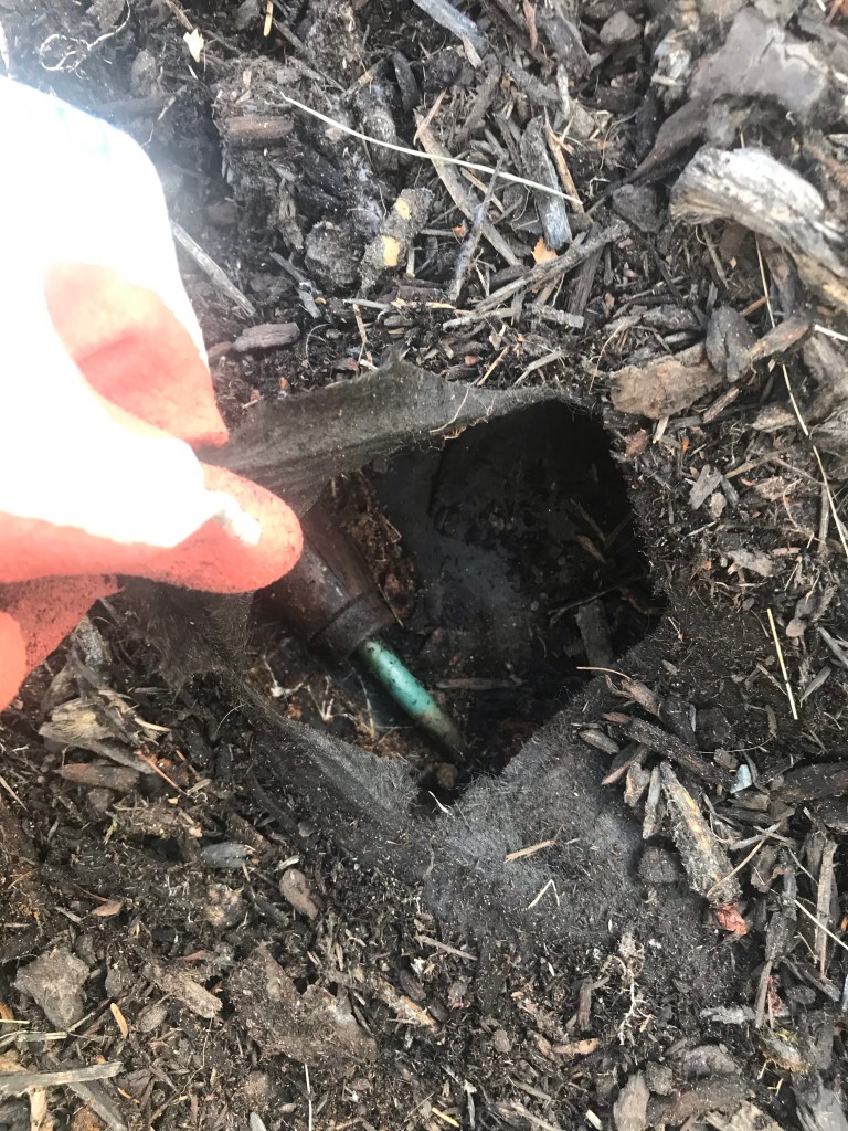 I was digging along side my driveway and fairly close to the street.  I was attempting to add curb appeal by planting some perennials in the barked strip.  I dug down a few inches and found some garden fabric that had to be cut away.  Underneath it was a nozzle looking item attached to what looked like a thin green tube.  I lightly touched the tube with my gloved hand and couldn’t really tell what it was.  I didn’t want to pull on it for fear of dislodging it or breaking it and possibly hurting myself.  I thought any utilities would be better protected, but I felt the need to be cautious just in case.  The safe bet would be to leave it alone until identified.