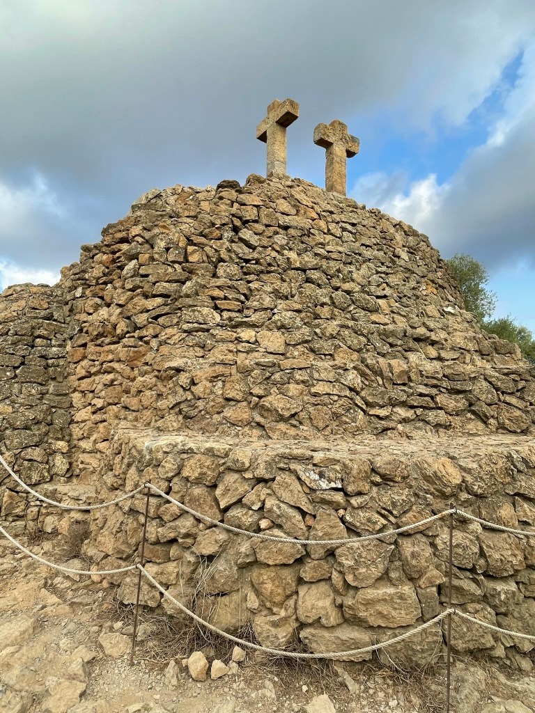 One of the first trails we took within the lush park lead us up to 3 stone crosses perched atop a mound of stones. Turó de les Tres Creus. A bench at the base of it afforded us a quick rest. I took the time to scribble in my journal thanking the clouds for shielding us from the sun for a bit. It was hot and humid and my sun dress was sticking to me.