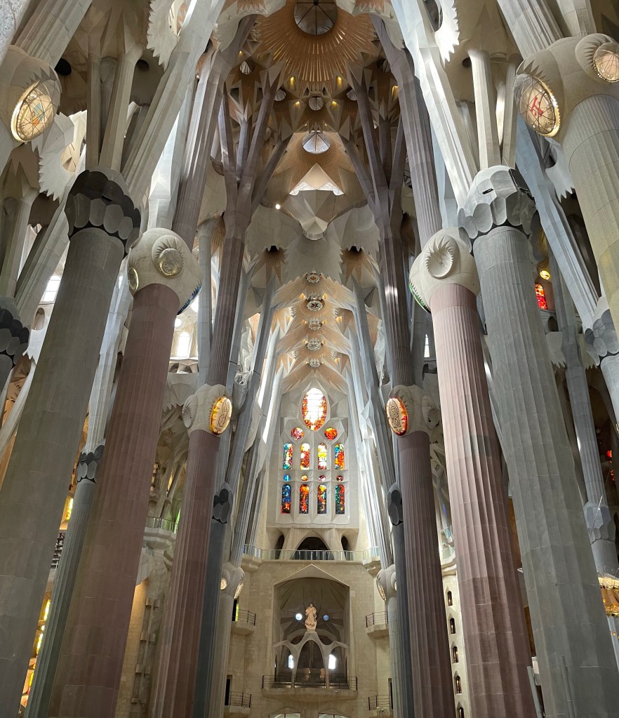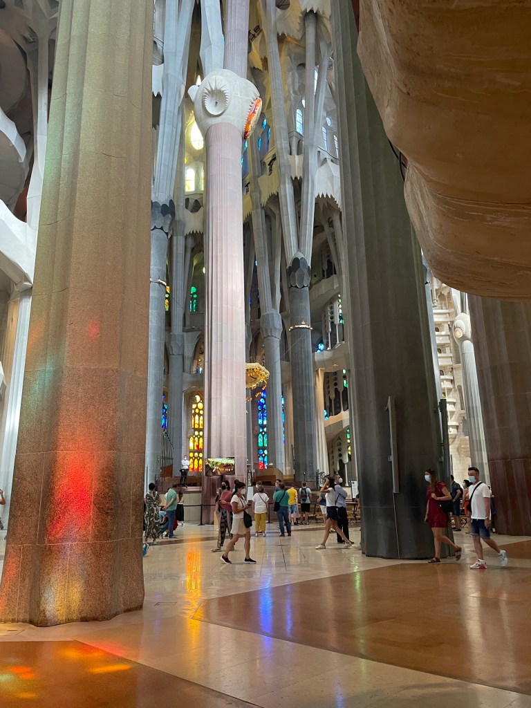 “The tall columns stretch to the heavens branching out like the trees Gaudí meant them to be.  The floor reflects the mosaic stained glass windows.  Organ plays.  Even if it is just a recording, its notes reverberates off the walls and columns and windows.  The design has both beauty and purpose.”