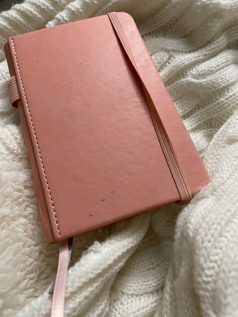Tonight, I open the little, light pink one.  It has a connected book marker, an elastic band to hold it closed, and a loop to hold a pen.   All in matching color.  Inside the cover is written: